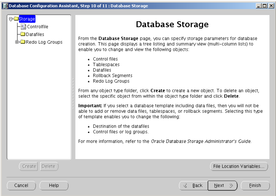 Choisir l'option du stockage adéquate à votre environnement, puis définissez l'emplacement de stockage des datafiles.